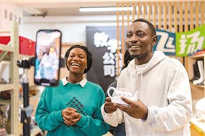 6月25日,浙江省金华职业技术学院商学院电商实战教学部现场,来自卢旺达的非洲留学生正在练习中文“直播带货”。胡肖飞摄(人民图片)