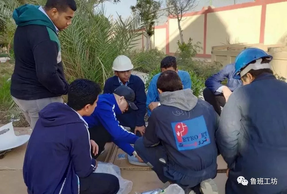 2019年12月下旬,天津轻工职业技术学院、天津交通职业学院专业教师及企业工程师联合团组26人飞赴埃及,受命完成埃及鲁班工坊的设备安装与调试、实训室装饰等任务,同时与埃及教师共同研讨确定鲁班工坊项目初中高级培训大纲及培训课程标准,对埃及鲁班工坊的师生进行现场培训。